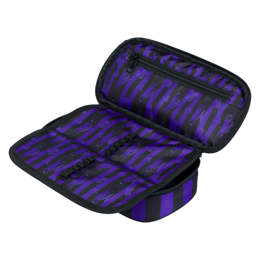 Školní penál etue s unikátním motivem populárního amerického seriálu Wednesday. Součástí penálu je hlavní kapsa a výklopná kapsička s přepážkou a gumičkami na tužky a jiné psací potřeby.
