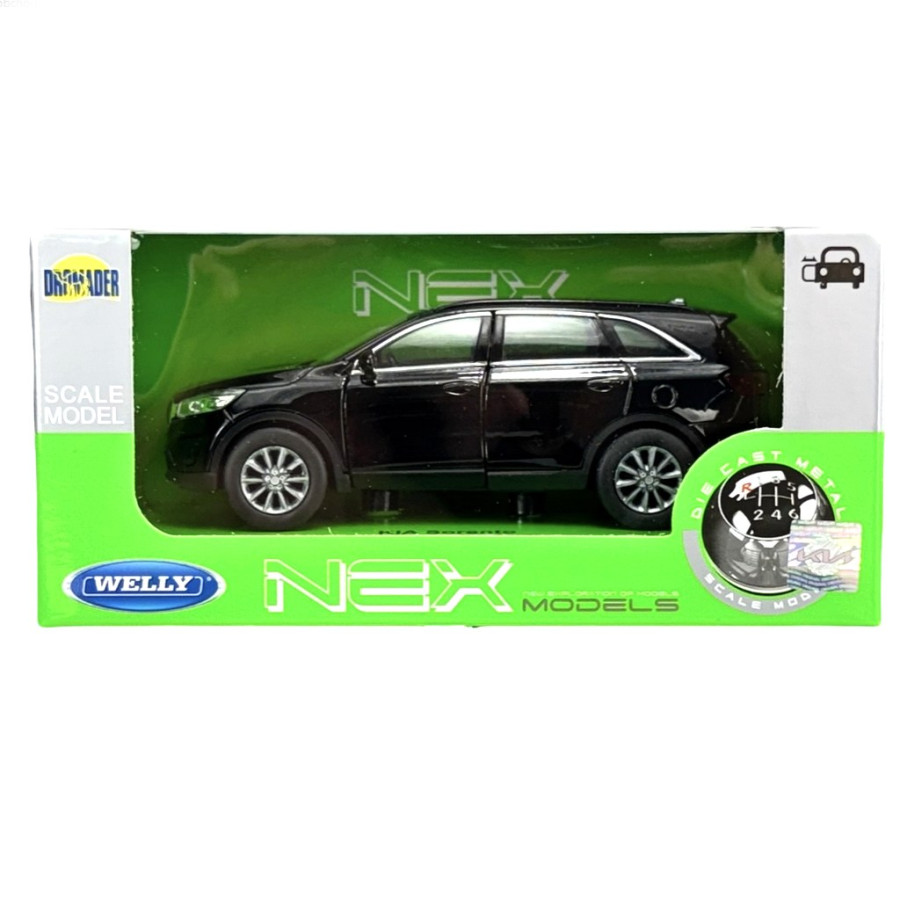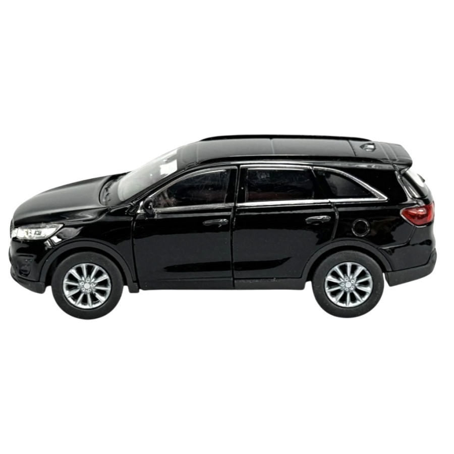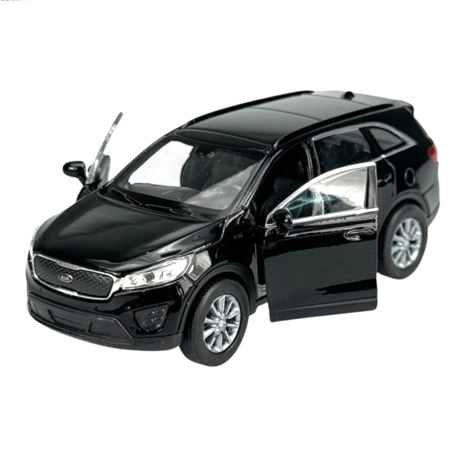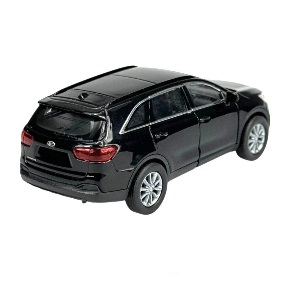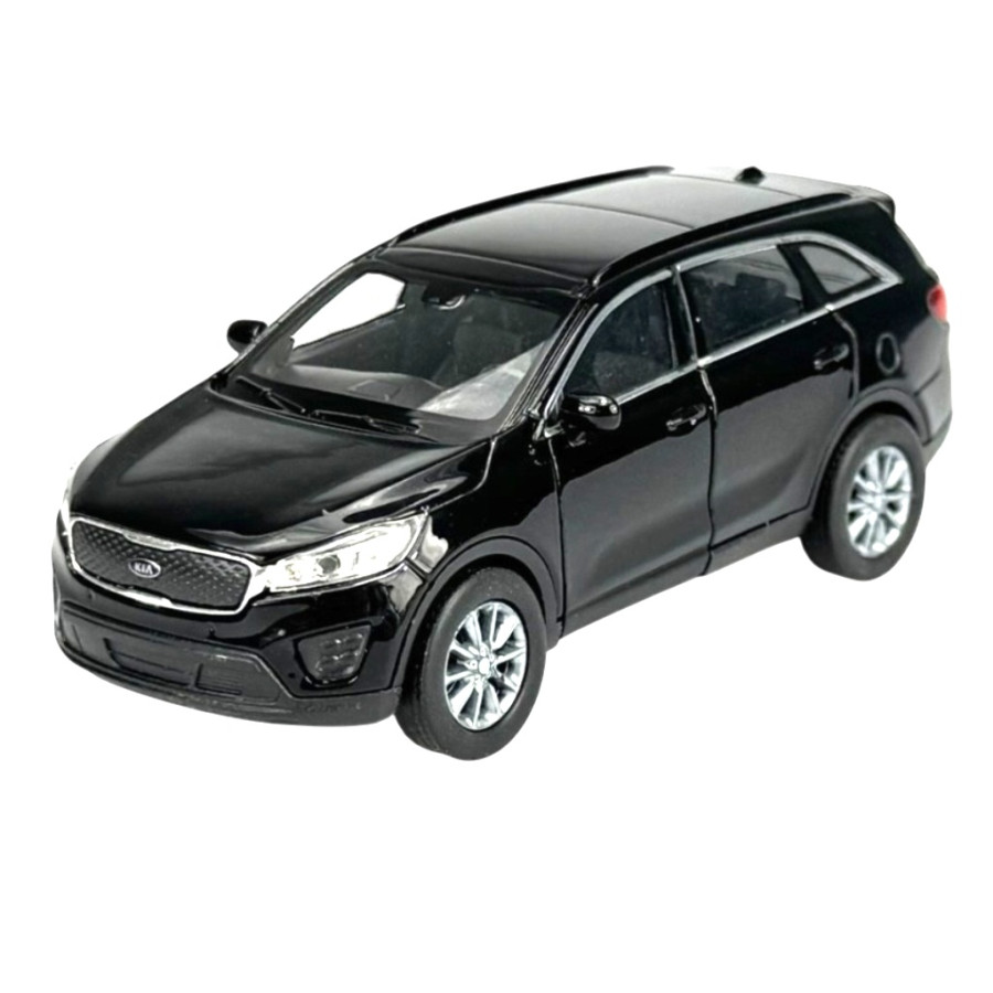 Kovový model auta Kia Sorento v černé barvě a měřítku 1:34 značky Welly. Model autíčka má kovové osy kol a detailní zpracování karoserie včetně interiéru automobilu. Na modelu se otvírají přední dveře.