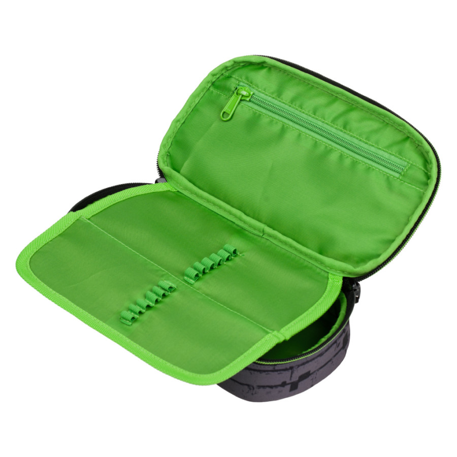 Kompaktní penál na zip s prostornou hlavní komorou a dvojitou výklopnou chlopní nabízí dostatek prostoru pro psací potřeby i drobnosti.