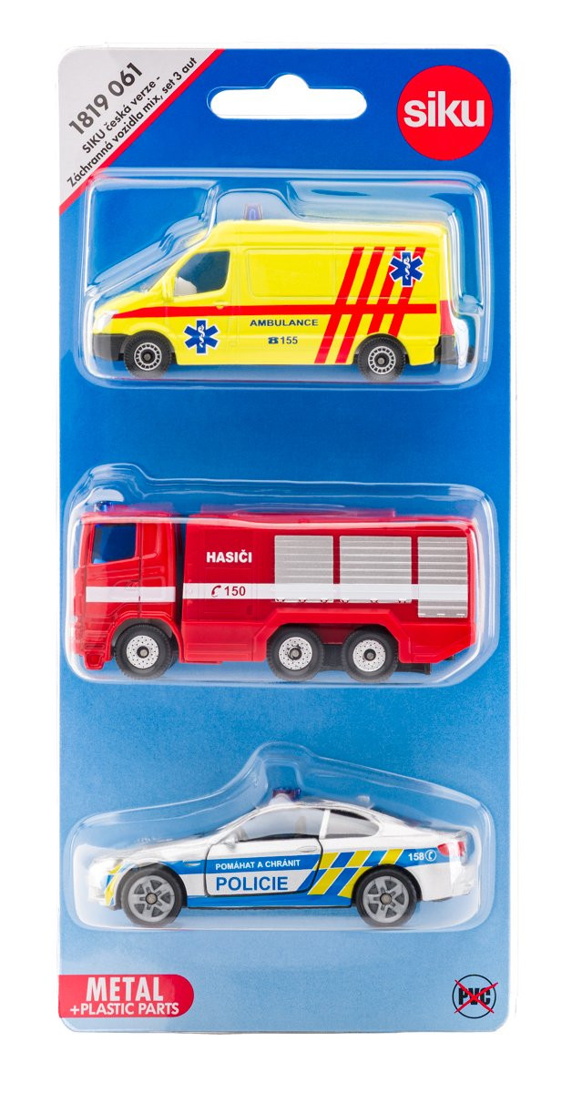 Sada obsahuje tři vozidla: Velký hasičský vůz, Ambulance dodávka a Policie osobní automobil BMW M3 coupé.
