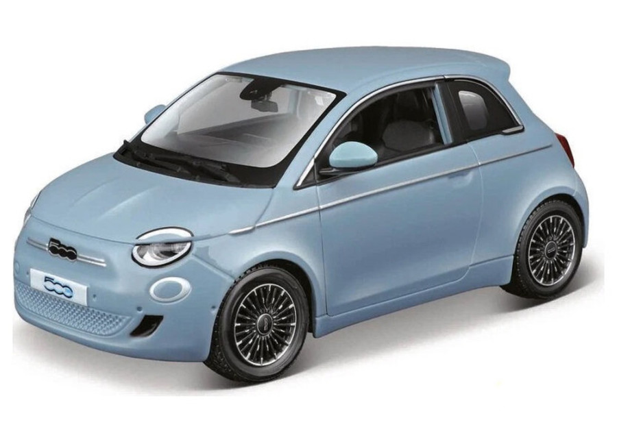 Kovový model auta Fiat 500e (2023) modré barvy v měřítku 1:24 značky Bburago. Karosérie modelu je vyrobena z kovu a obsahuje velké množství detailů. Model auta Fiat 500e (2023) má otvíratelné dveře.