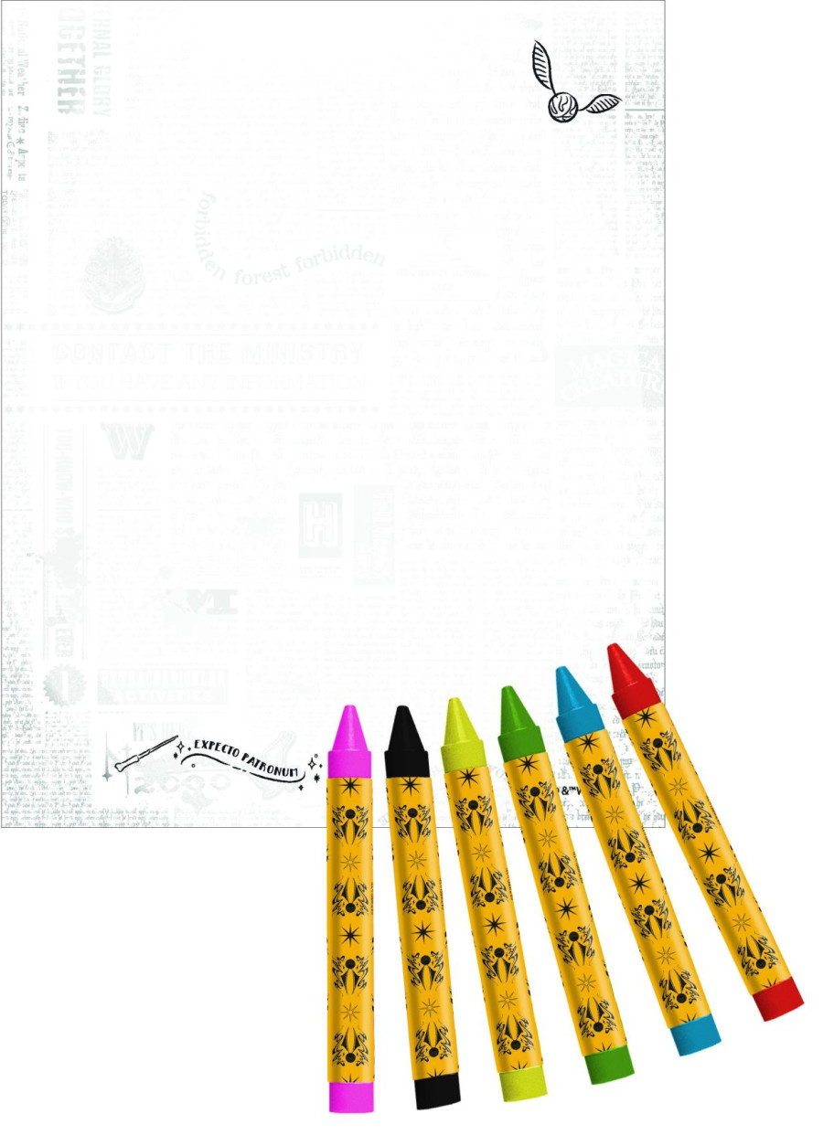 Součástí balení je také blok (32 listů) s obálkou Harry Potter a sada 12 voskovek, se kterými si děti mohou vytvářet vlastní magické obrázky.
