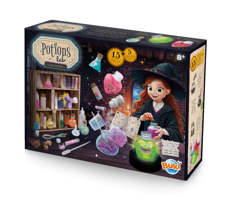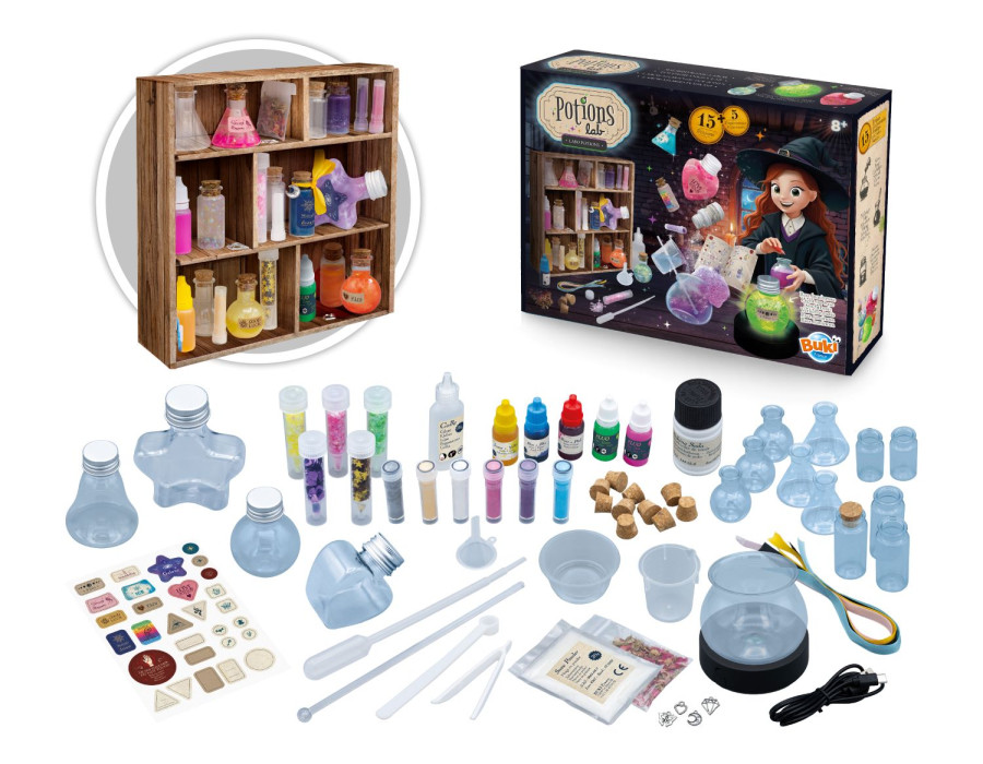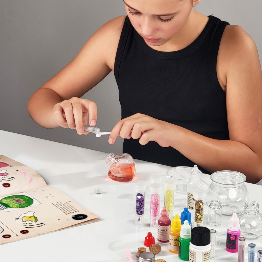 Vytvořte si 15 barevných, jiskřivých elixírů z bohaté nabídky zdobných materiálů. Ozdobte je perleťovými pigmenty, konfetami, stuhami a přívěsky. Použijte LED svítící základnu a proměňte svůj elixír v báječné noční světlo.