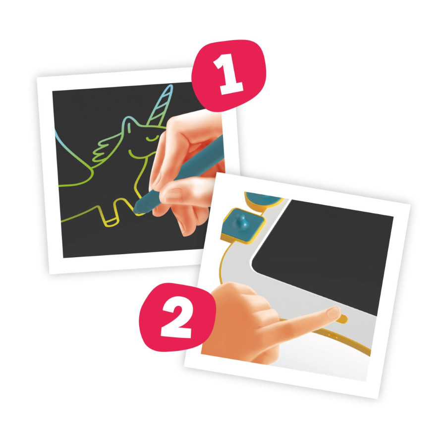 Příslušenství tvoží pero se dvěma hroty a 4 tvarovaná razítka. Použijte svou kreativitu a namalujte originální obrázek. Madlo umožňuje snadné přenášení.