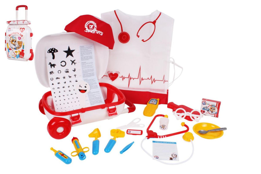 Děti mohou za svými pacienty vyrážet s tímto doktorským kufříkem, který je na kolečkách. Kufřík obsahuje spoustu nástrojů a náčiní, které potřebuje každý lékař. Tuto sadu oceníte pro svoji snadnou manipulaci, kufřík je doplněn o vysouvací rukojeť.