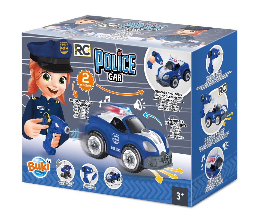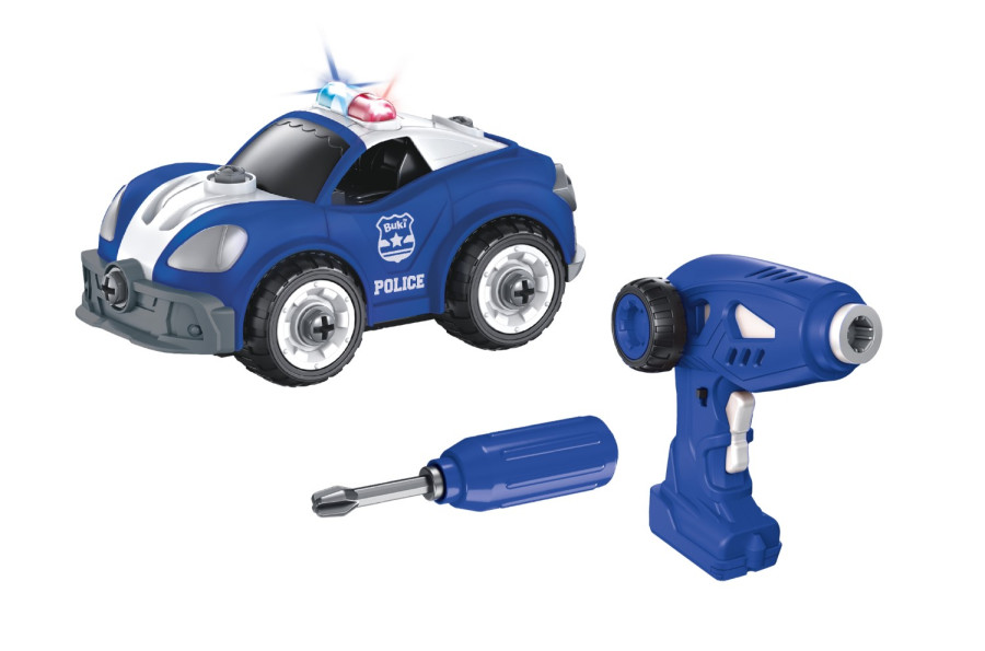 Šroubovací stavebnice Policejního auta na dálkové ovládání. Stavebnice pro šikovné kluky, kteří si vlastní hračku chtějí sestavit. Stavebnice obsahuje dvě varianty, které je možné střídat přestavěním autíčka. Součástí je elektrický šroubovák sloužící i jako dálkové ovládání. Autíčko může jezdit vpřed, vzad, vlevo a vpravo.