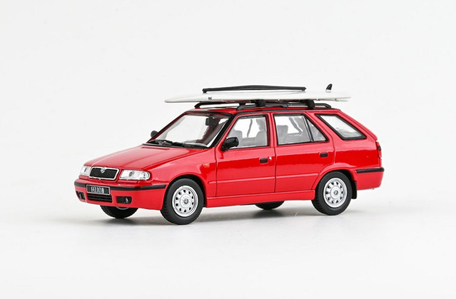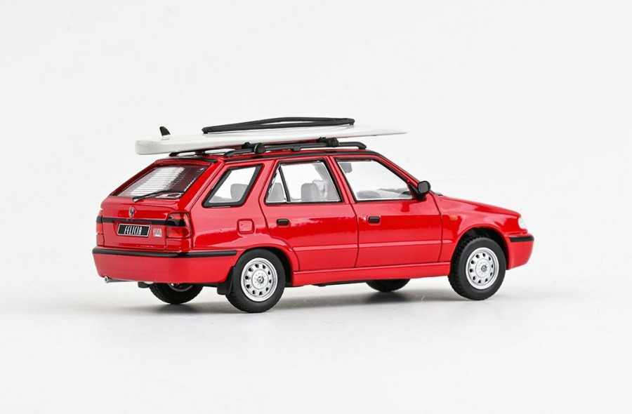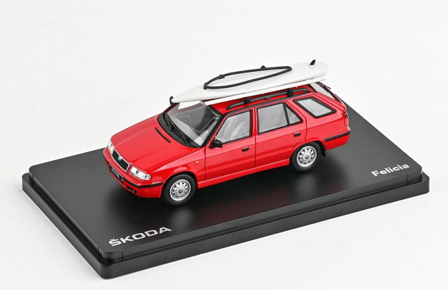 Model auta Škoda Felicia FL Combi (1998) se surfovacím prknem v měřítku 1:43 vyrobený českým výrobcem modelů Abrex, který může být hezkým dárkem pro každého fandu této značky Škoda.