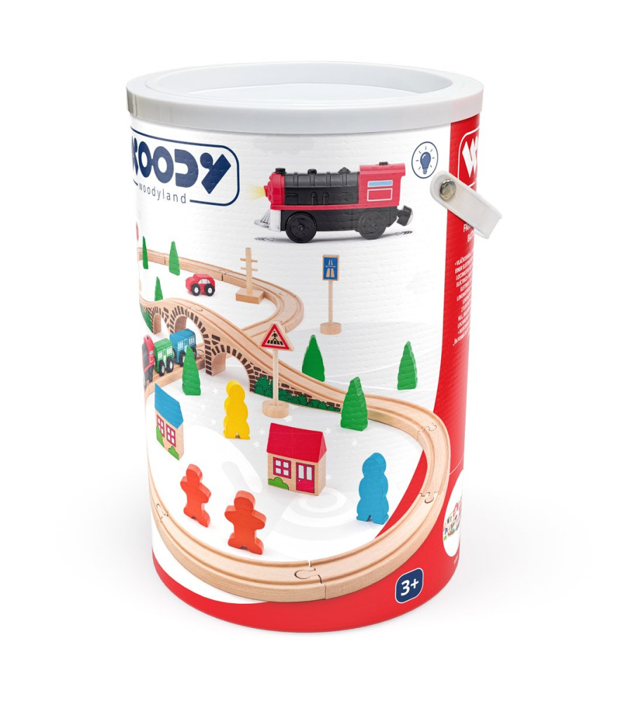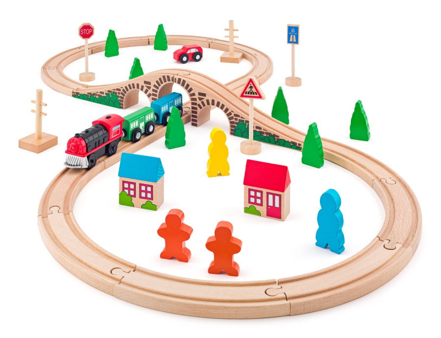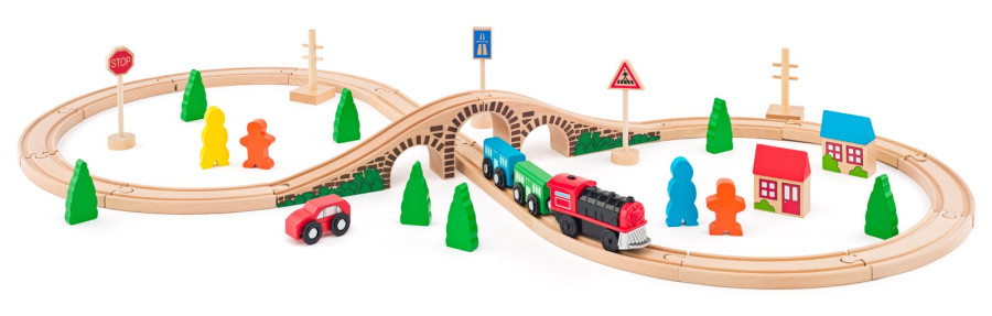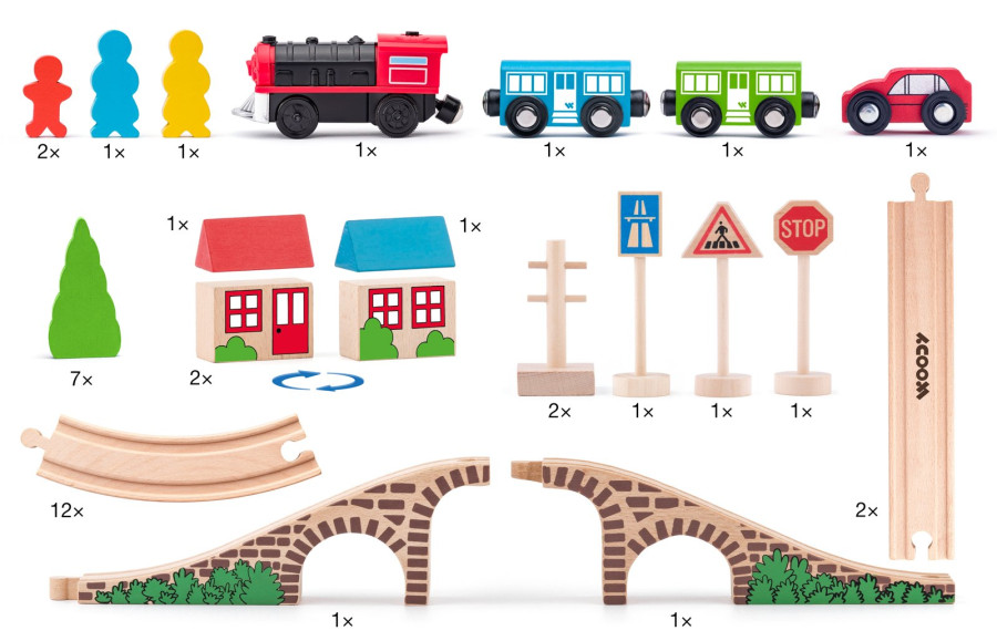 Tato vláčkodráha je vhodná koupě jako první vláčkodráha pro Vaši ratolest. Obsahuje koleje, most, vlak se dvěma vagony, autíčko, značky, postavičky a stromy. Tento základní set je možné rozšiřovat velkým množstvím příslušenství, které najdete v naší nabídce.