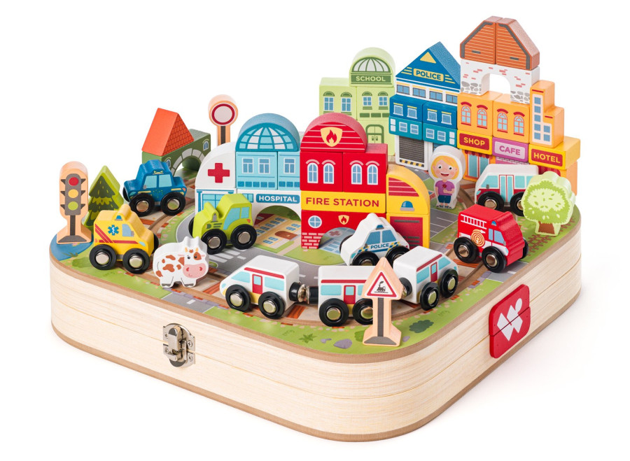 Otevřete kouzelný svět železnic v dřevěném kufříku! Po jeho rozložení vznikne na obou stranách jeho víka krajina s dráhou ve tvaru osmičky s vyfrézovanými kolejemi.