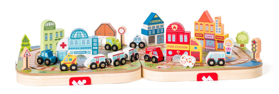 Dřevěný vláček, dřevěná autíčka a kostky pro stavbu domečků tvoří dokonalou herní sadu v jedinečném designu od české výtvarnice.