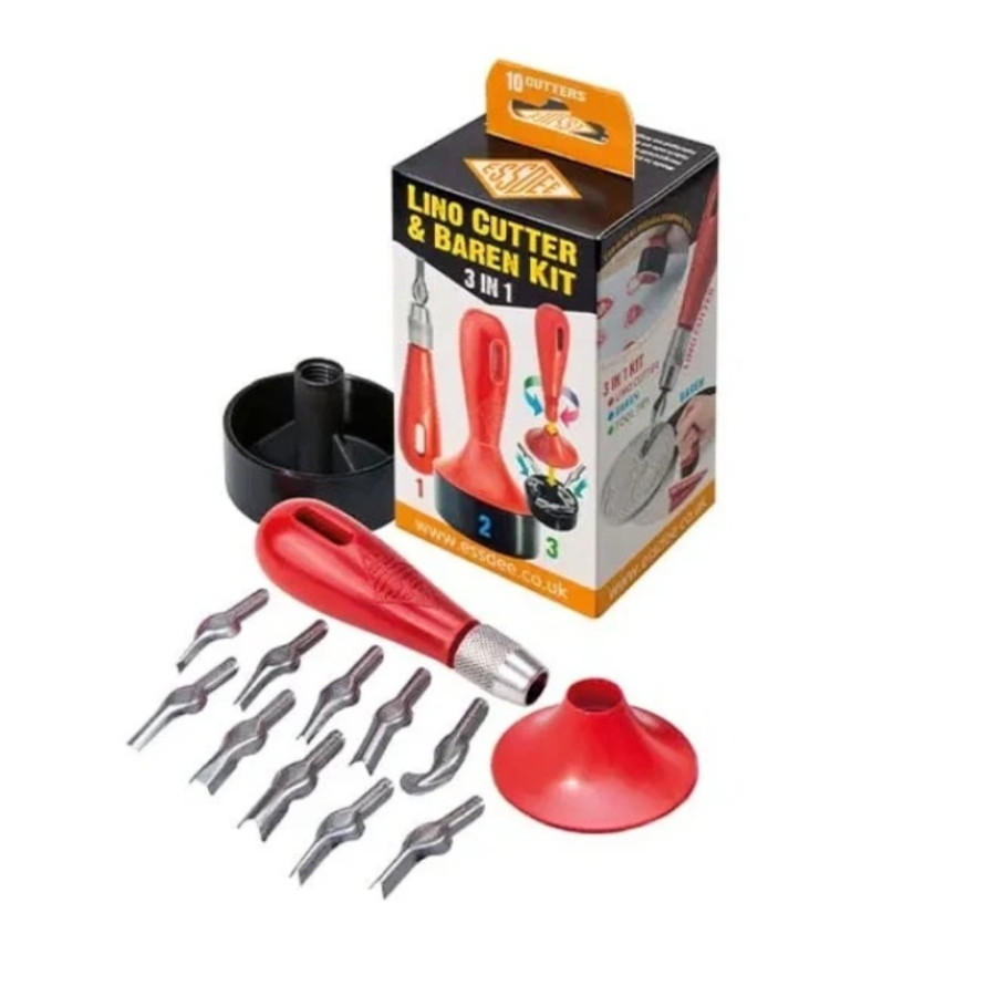 Inovativní sada Essdee 3v1 Lino Cutter and Baren Kit je skutečně všestranným pomocníkem pro linořezbu a tisk. Obsahuje 10 precizně broušených linořezacích nožů vyrobených z vysokouhlíkové oceli, které zajišťují ostré a čisté řezy.