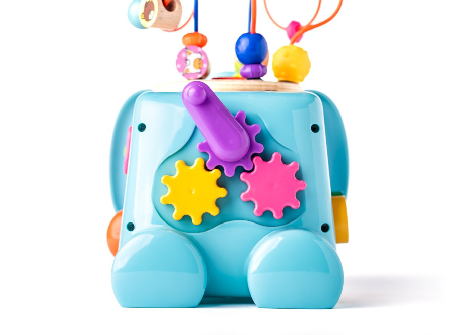 Kličkou na zadečku rozpohybujete ozubená barevná kolečka. Na boku slona naleznete malé bludiště se sovičkou a ptáčkem. Na druhém boku je umístěno počítadlo s barevnými korálky a váleček s notami.