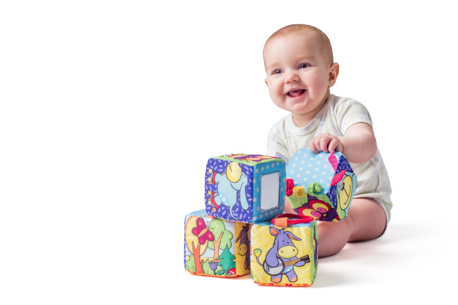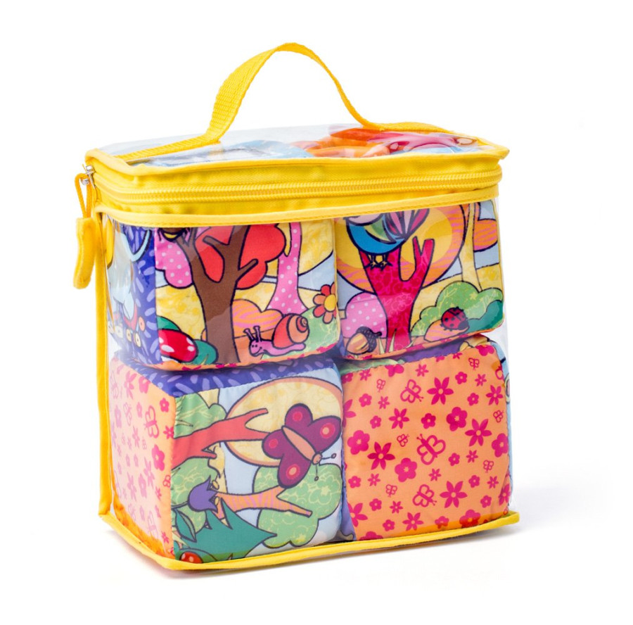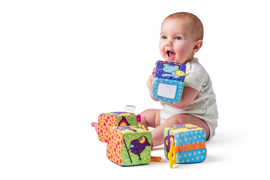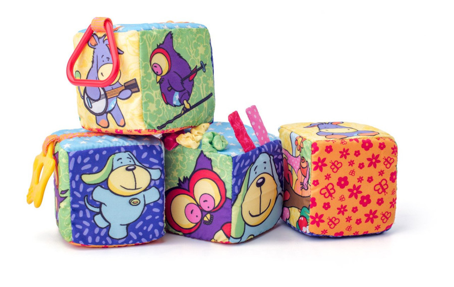 Všechny látkové kostky obsahují různé hrací komponenty: chrastítka, kousátka, pískátka, zrcátko vyrobené z bezpečnostní fólie ve kterém může dítě pozorovat svůj obličej a části vydávající zvuky mačkaného papíru. Všechny tyto komponenty stimulují dětské smysly i jemnou motoriku. Rozměr jedné kostky: 9 x 9 cm. Design německé návrhářky Britty Hurter