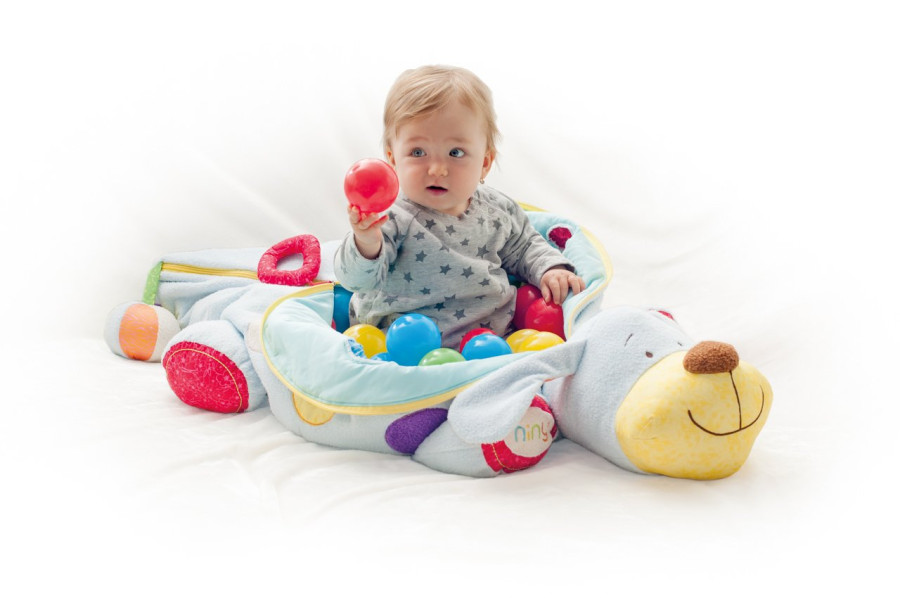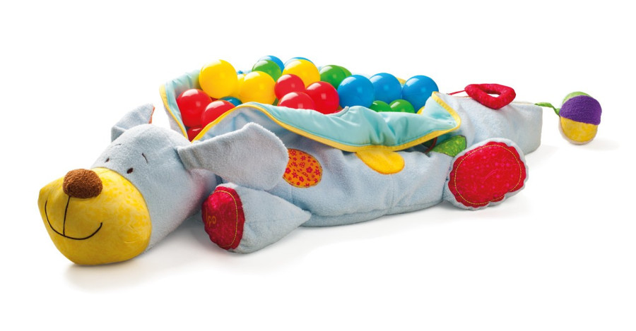 Velký plyšový kamarádk pejsek IPO s 60ti míčky je uklidňující hračka z kolekce Niny. V jeho těle je uloženo 60 barevných plastových míčků. Ocásek je vyrobený z látkového míčku, který vydává zvonivý zvuk.