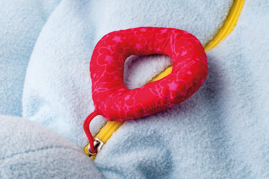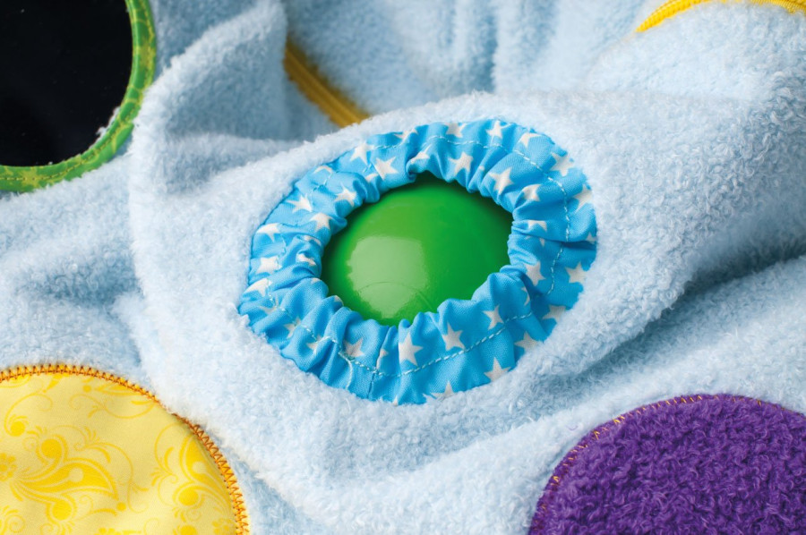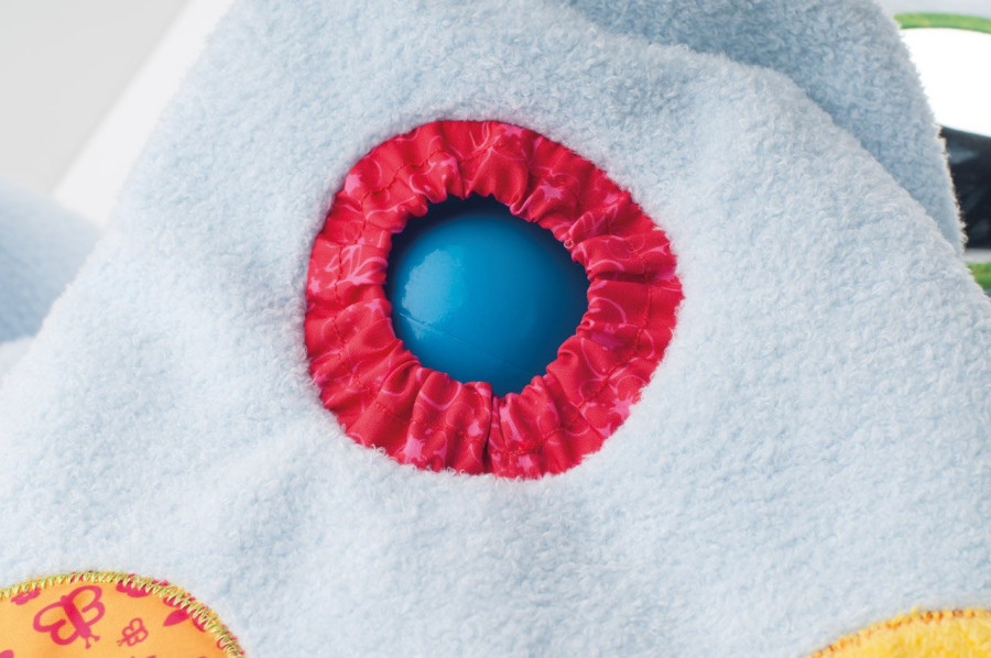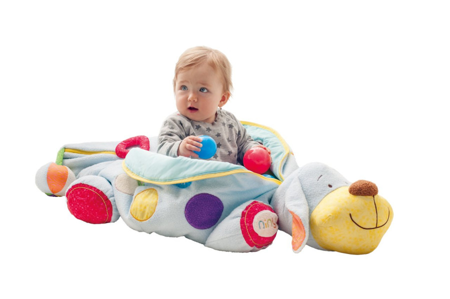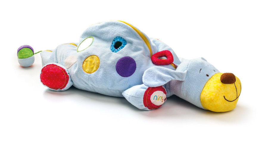 Na těle pejska jsou hrací prvky, prostrkávací okénka, zrcátko. Ouška šustí. Všechny použité materiály jsou příjemné na dotek a nabízí dětem ničím nerušený čas relaxace. Design německé návrhářky Britty Hurter. Rozměr: 124 cm (šířka)