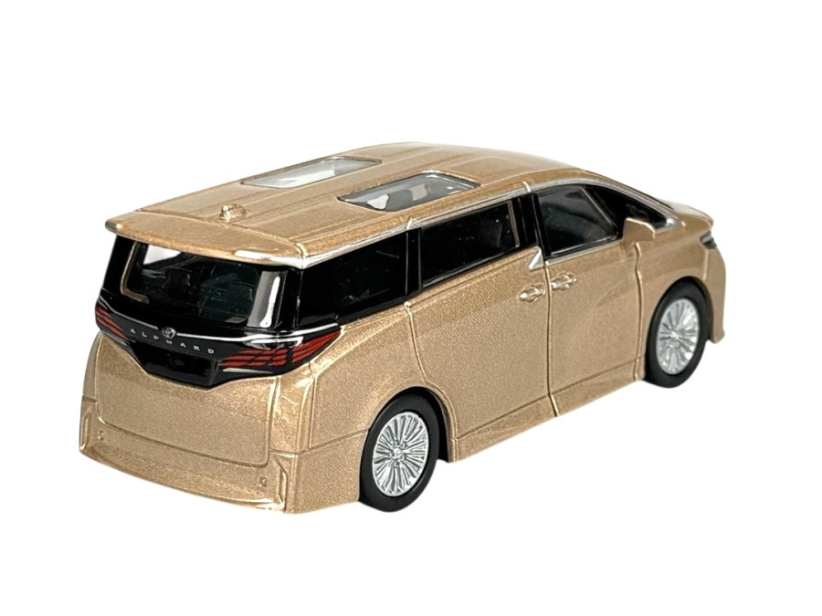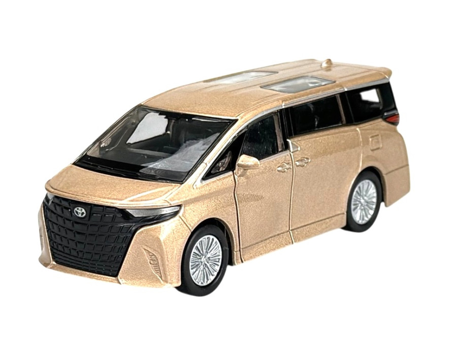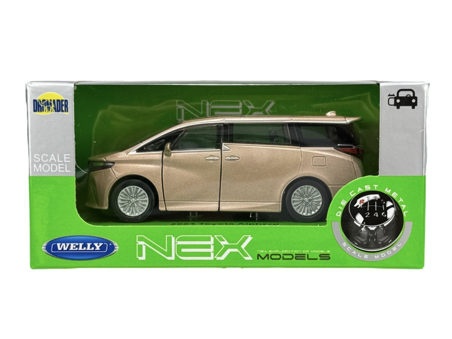Kovový model auta Toyota Alphard 2024 ve zlaté barvě a měřítku 1:34 značky Welly.