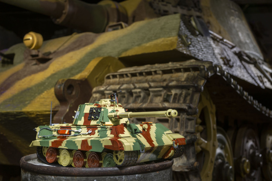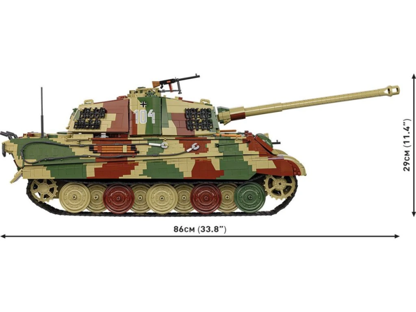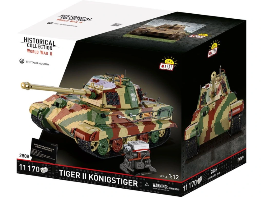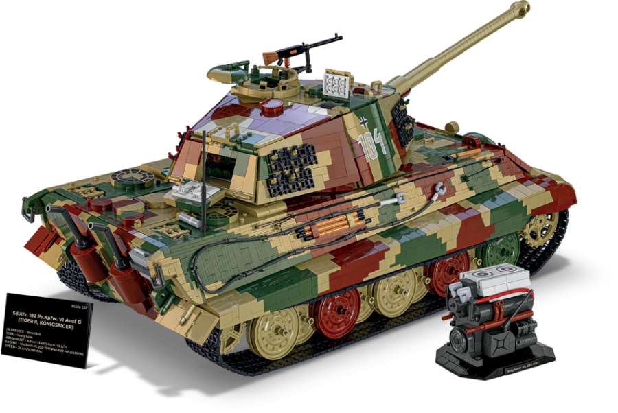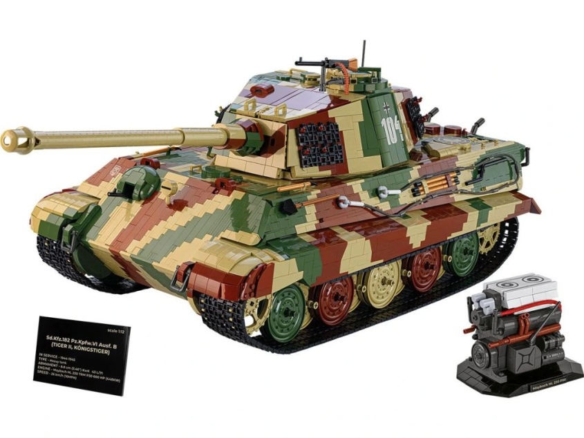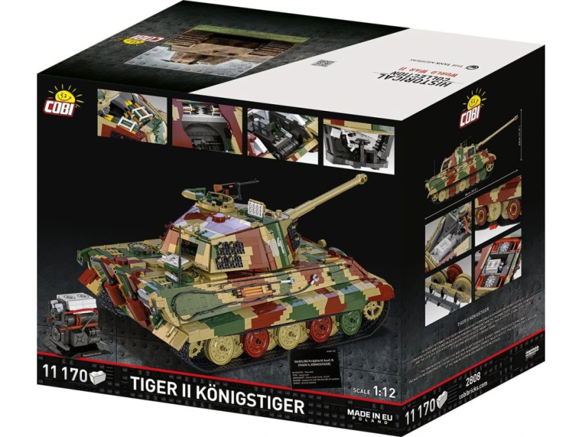 Stavebnice modelu německého tanku Tiger II KÖNIGSTIGER ve velkém měřítku 1:12 sestávající se z 11170 dílů v kamufláži západní fronty. Největší a nejdetailnější model ze stavebních kostek, který je na trhu dostupný.