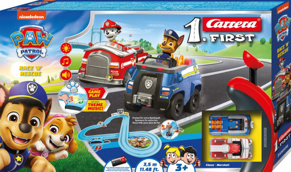 Autodráha Carrera FIRST dlouhá 3,5m s auty ze seriálu Tlapková patrola, pro děti od 3 let, na baterie, obsahuje napájecí díl s interaktivními hrami, zvuky a světly, rovinky, zatáčky, vrtule pro větší zábavu při jízdě, ovladače a dekorace s tématikou Tlapková patrola. Délka trati: 3,5 m Rozměry po sestavení: 115 x 115cm Obsah balení: