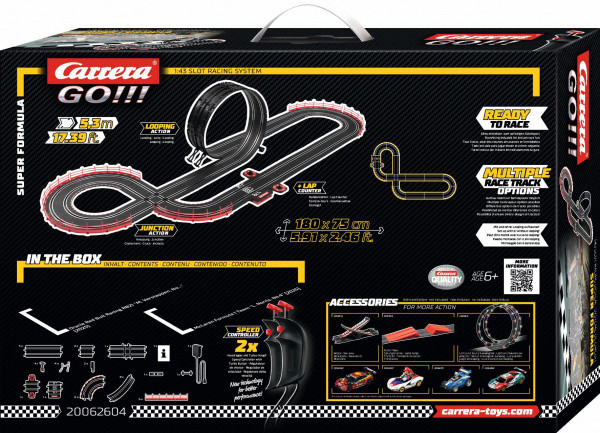 Autodráha Carrera GO!!! dlouhá 5,3m s auty F1 Red Bull a McLaren, obsahuje, křižovatku, rovinky, zatáčky, looping, díl s počítadlem kol a další díly. Můžete si sestavit další různé trati podle své fantazie. Délka trati: 5,3 m Rozměry po sestavení: 180 x 75 cm Obsah balení: