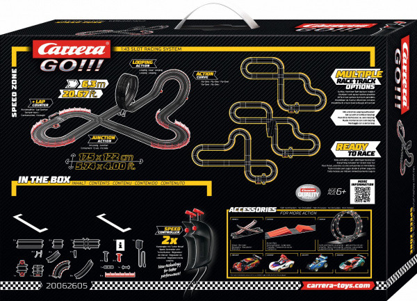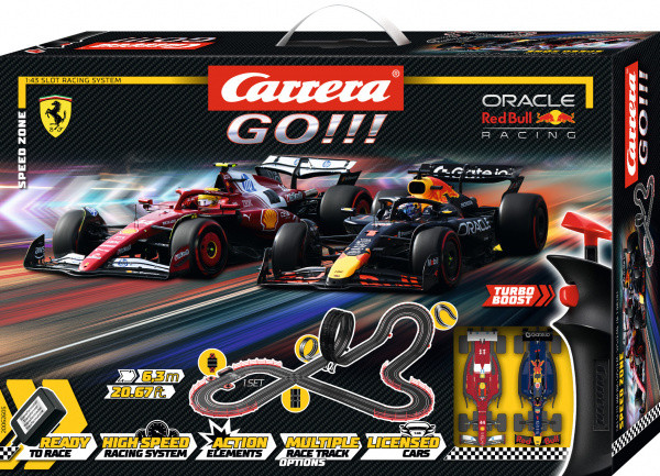 Autodráha Carrera GO!!! dlouhá 6,3m s auty F1 Red Bull a Ferrari, obsahuje, křižovatku, rovinky, zatáčky, kolmou stěnu, looping, díl s počítadlem kol a další díly. Můžete si sestavit další různé trati podle své fantazie. Délka trati: 6,3 m Rozměry po sestavení: 175 x 122 cm Obsah balení: