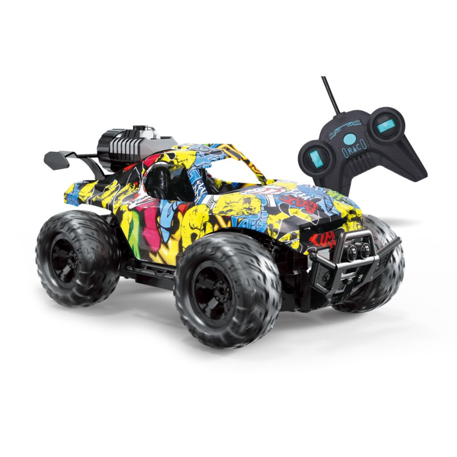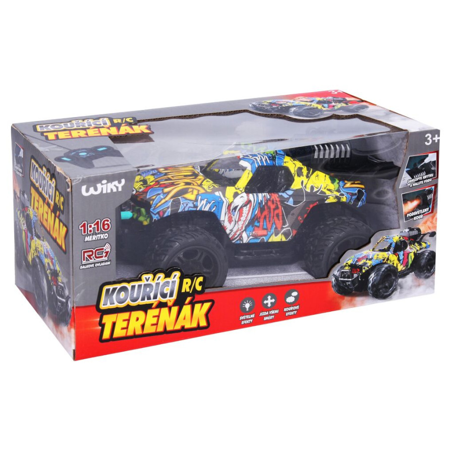 Terénní auto na dálkové ovládání graffiti rozměru 24x14,5x10,6 cm. Auto má světelné a kouřové efekty.