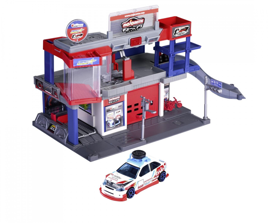 Tato dvoupatrová tuningová garáž z řady Majorette „Japan Series“, určená pro děti od 5 let, je plná funkcí. Garáž (35,5 x 45,5 x 23,5 cm) je přístupná z obou stran a je vybavena manuálním výtahem, rampou a světelnými a zvukovými efekty.