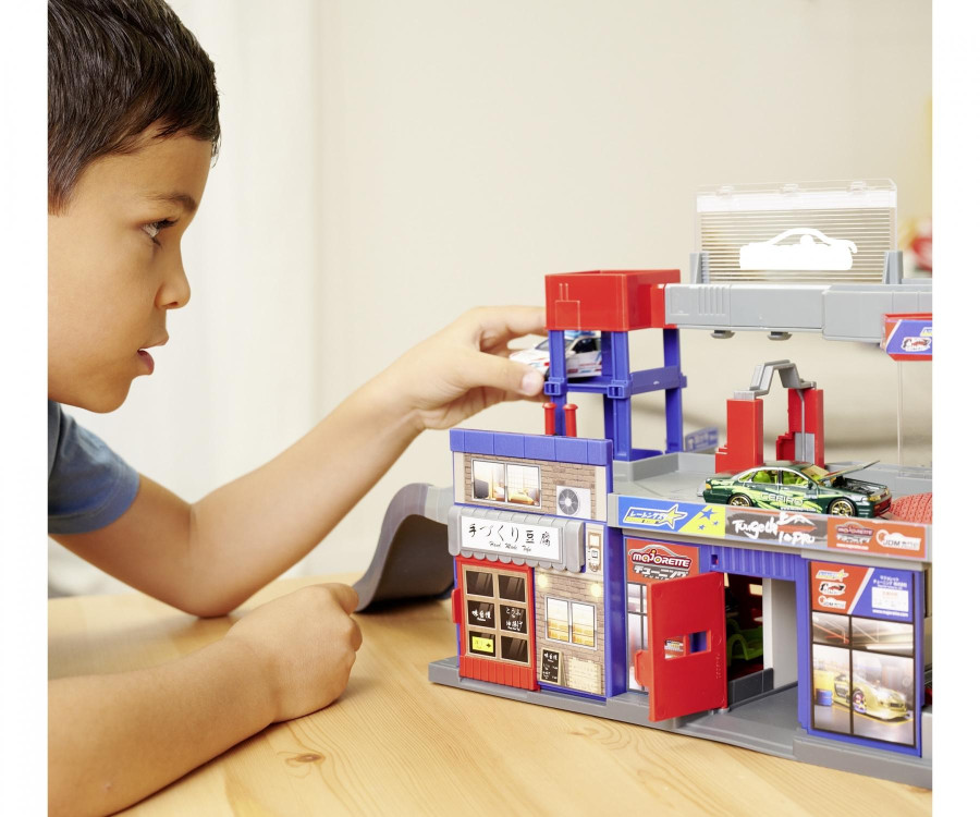 Tato garáž se pyšní prvky v japonském stylu, včetně obchodu s tofu, a je ideálním domovem pro auta „japonské série“ z řady Majorette Deluxe.