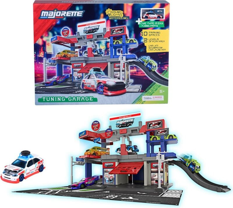Tuningová garáž Majorette má 2 patra, čerpací stanici, manuálně ovládaný výtah a světelné i zvukové efekty, zvedací plošinu, tuningovou část a 10 parkovacích míst. Jedno autíčko 7,5 cm součástí.