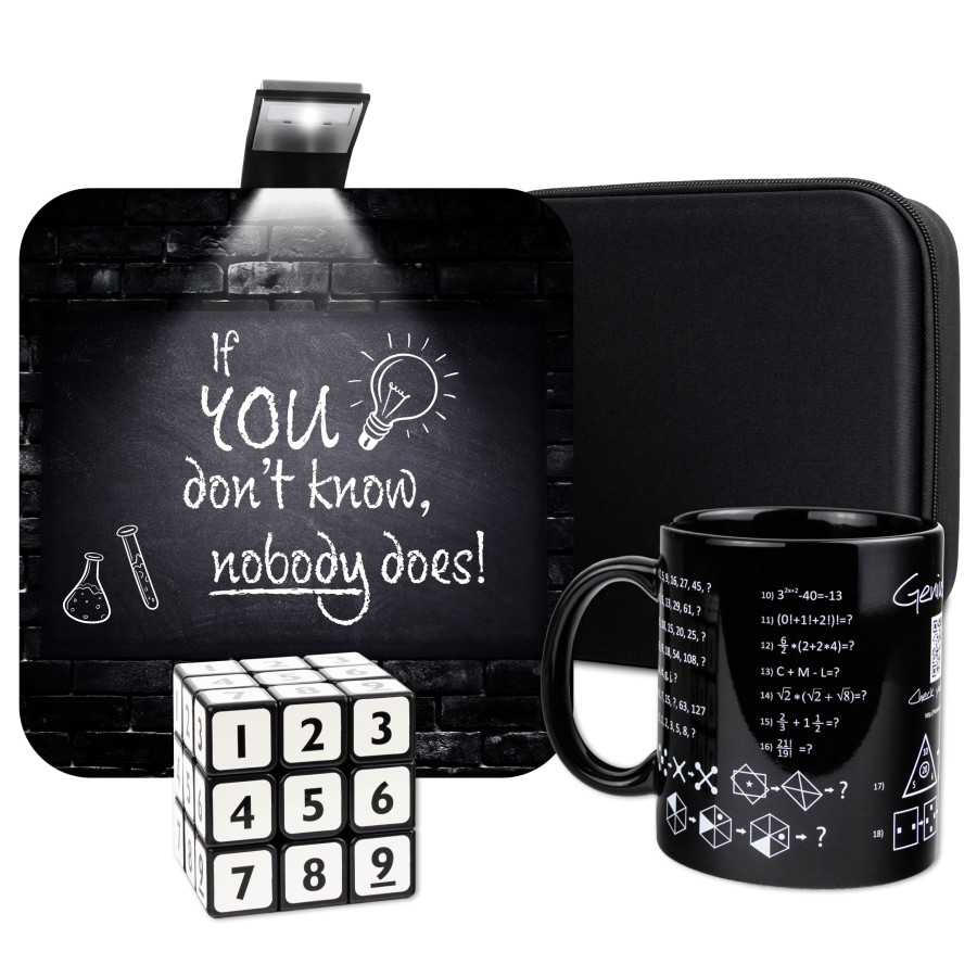 Dárková sada pro génia obsahující hrnek, lampičku, pouzdro, bílou sudoku kostku, dekorativní vložku. Sadu je ihned možné darovat jako dárek, není potřeba žádné další balení. Nápis na vložce: If YOU don’t know, nobody does! Výrobek v anglické jazykové verzi.