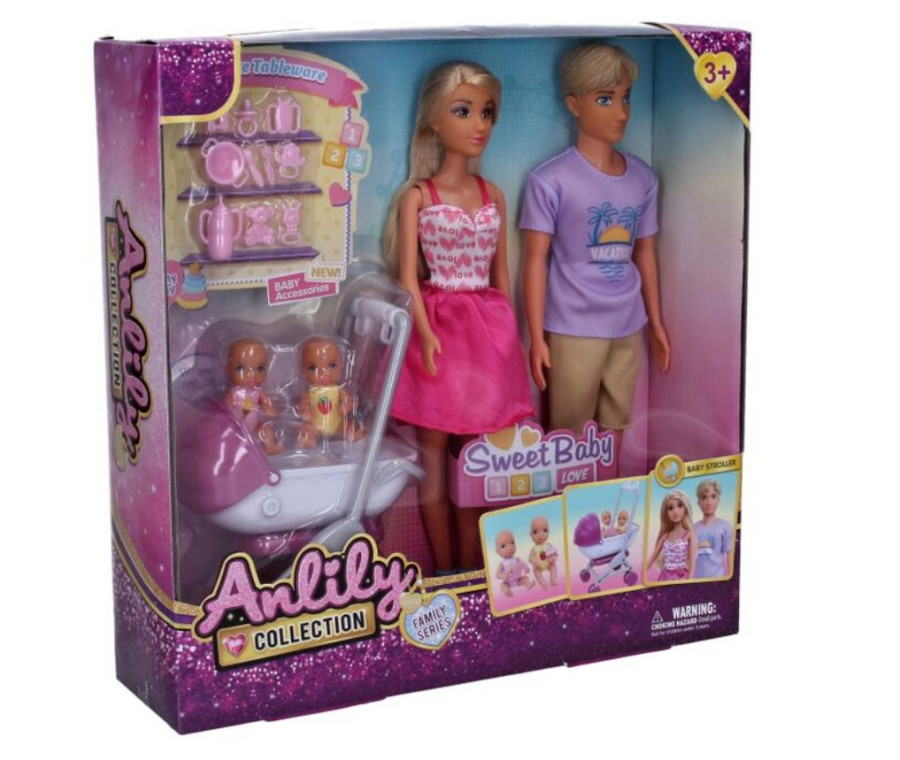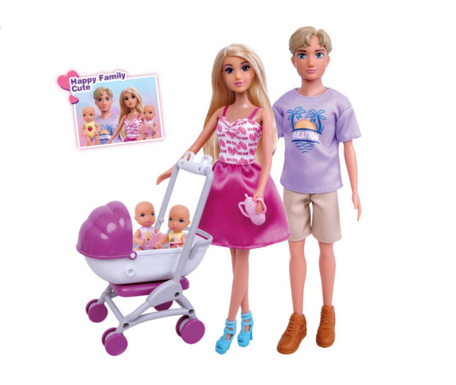 Plastová panenka s rodinou. Obsahem balení je panenka s manželem, 2 miminka, kočárek, doplňky pro miminka. Kočárek lze přestavit z hlubokého na sportovní.