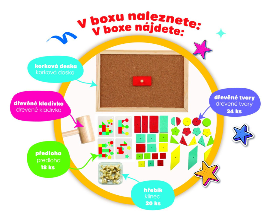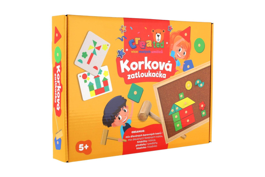 Korková zatloukačka s dřevěnými tvary, kladívkem, hřebíčky a deska z korku je výtvarná klasika, která děti nejen zabaví, ale i rozvíjí. Malí stavitelé si mohou vytvářet vlastní obrázky nebo skládat podle přiložených předloh. Rozměr balení 33x24x4.5 cm.