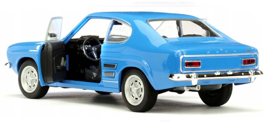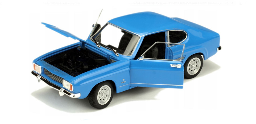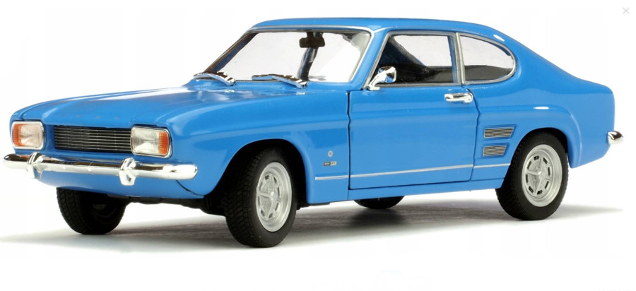 Kovový model auta Ford Capri 1969 v měřítku 1:24 značky Welly. Model má detailní zpracování karoserie včetně interiéru automobilu. Na modelu se otvírají přední dveře a kapota.Při použití síly je nebezpečí ulomení jednotlivých dílů. Doporučený věk 8 let.