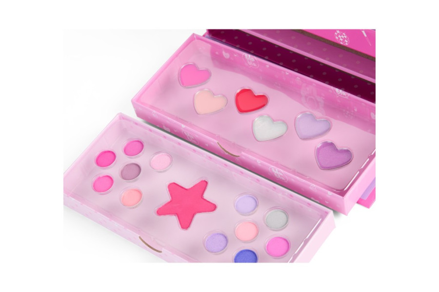 Kufřík třípatrový Beauty Create it! se zavíráním na magnet obsahuje tři patra kosmetických potřeb. První patro obsahuje 2× lak na nehty, pilník, 2× aplikátor, samolepky na nehty a tvářenku, druhé patro lesky na rty a třetí patro oční stíny a tvářenky.