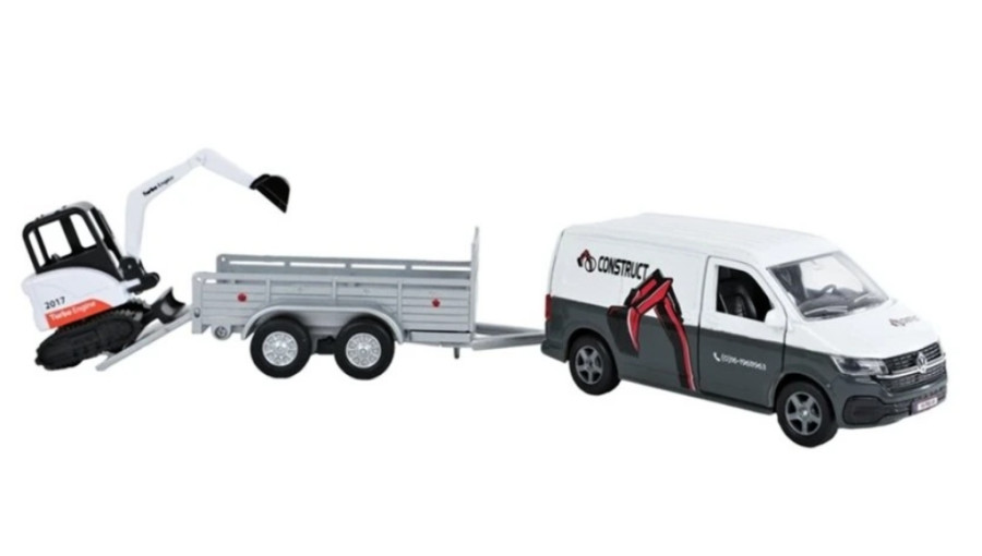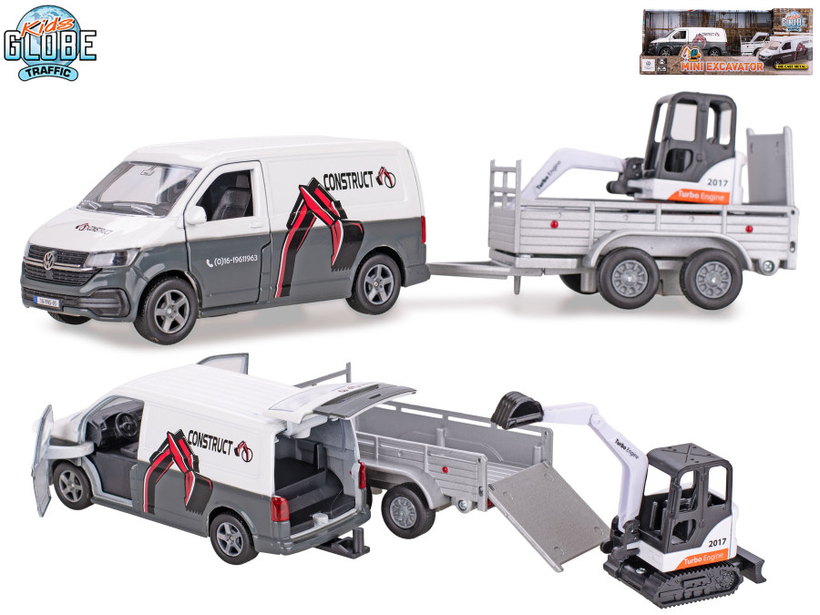 Kids Globe Traffic VW Transporter s přívěsem 27 cm zpětný chod s mini bagrem v krabičce.