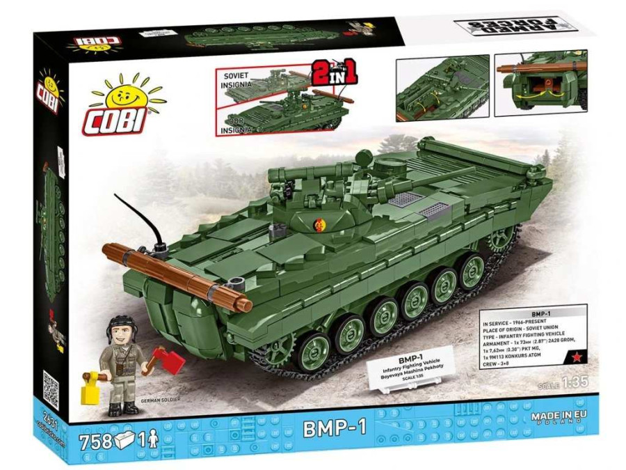 Bojového vozidlo pěchoty BMP-1 je v měřítku 1:35. Sestavený model měří 19,5 x 9,5 x 9 cm. Má mnoho funkčních částí. Balení obsahuje 758 kostek stavebnice a figurku velitele tanku v uniformě vojáka Národní lidové armády NDR.