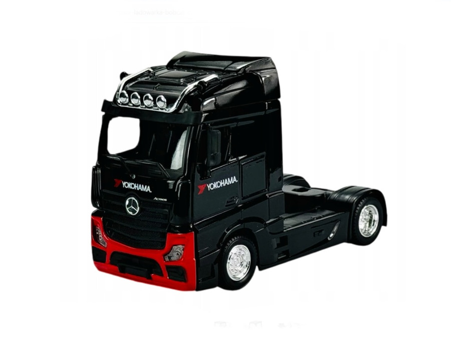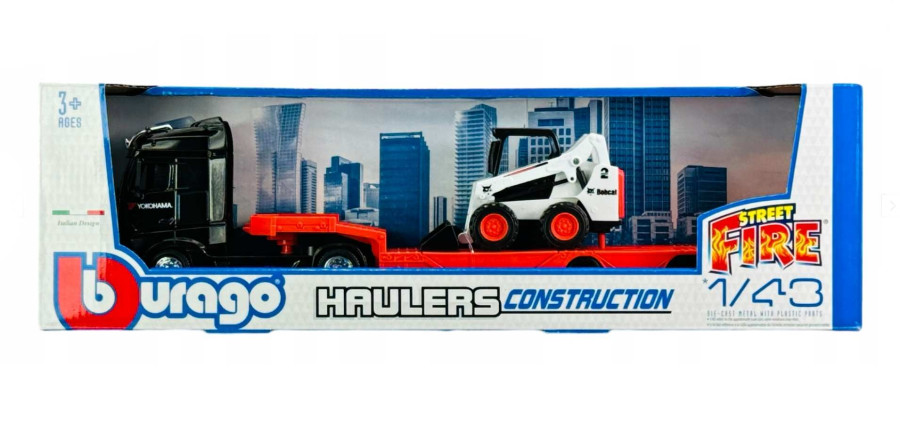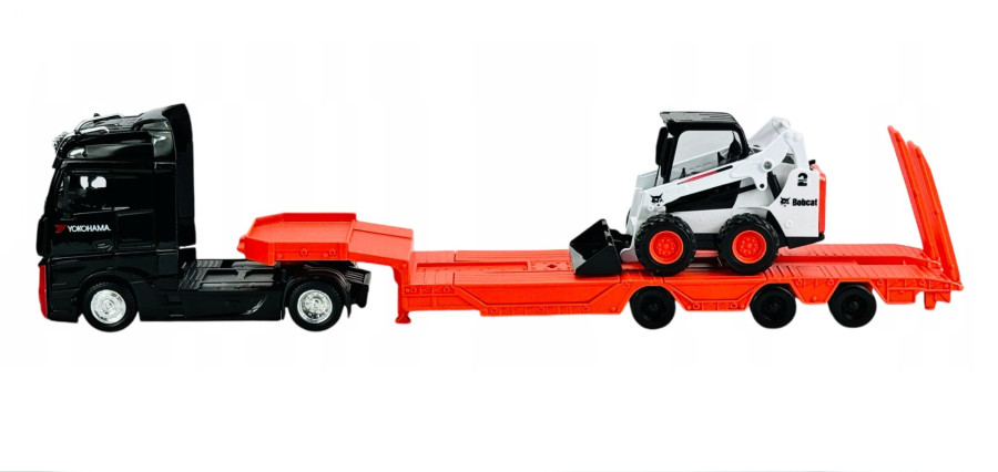 Model kamion Mercedes Benz Actros Gigaspace s přívěsem a modelem stavebnho stroje nakladačem Bobcat v měřítku 1:43 z kolekce Street Fire s vysokým důrazem na přesnost detailů.