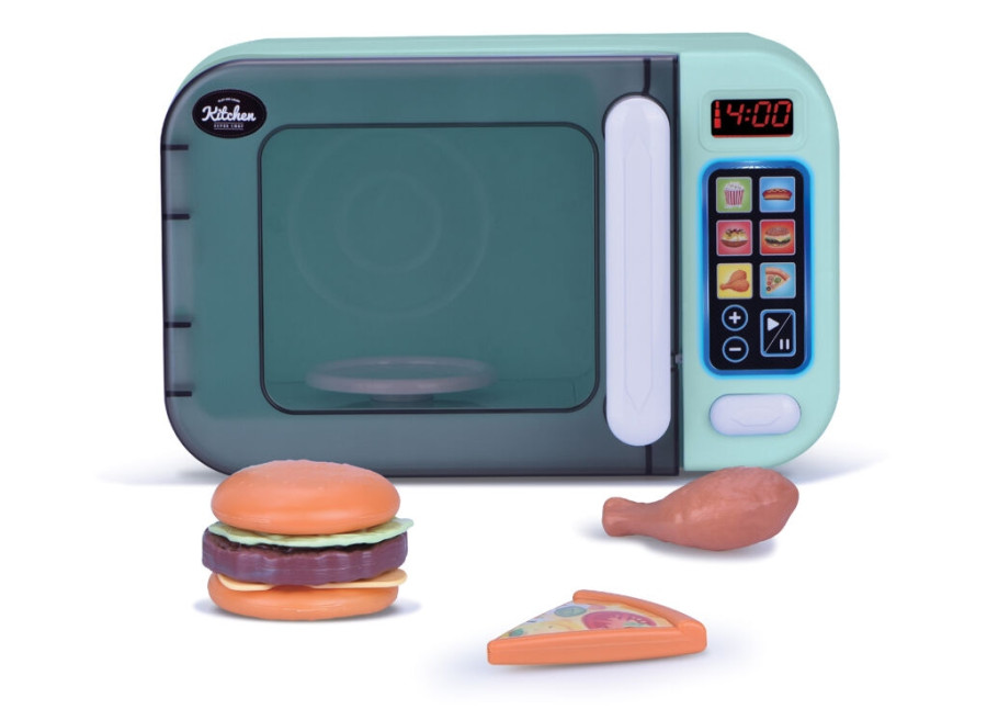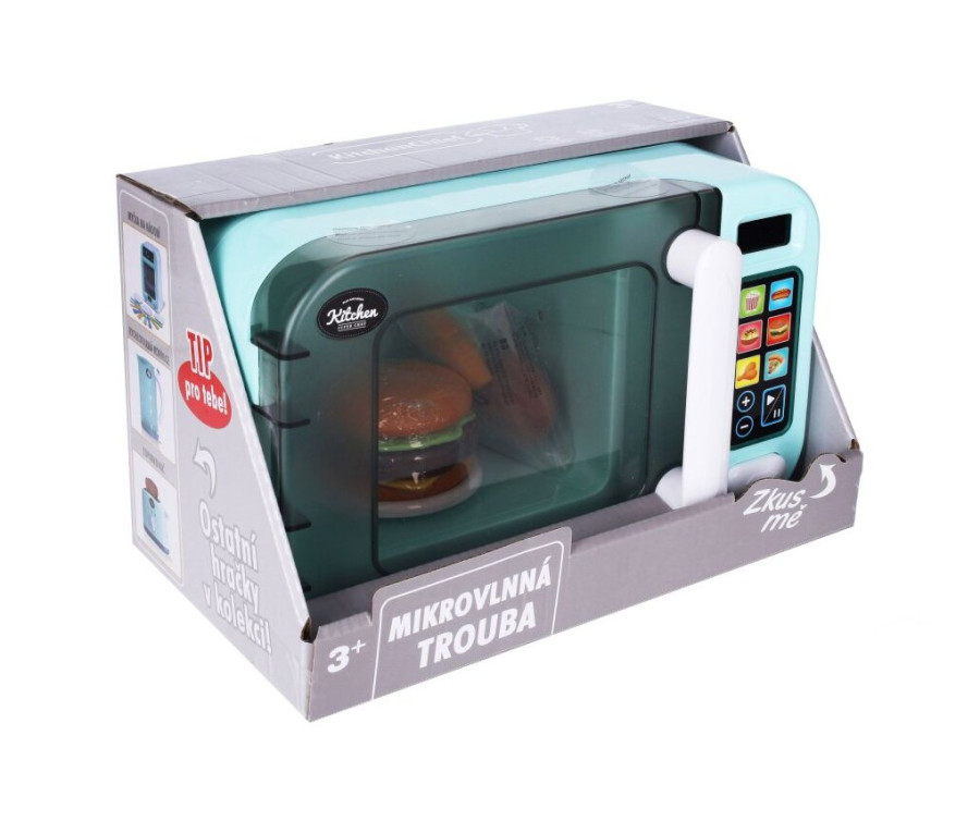 Mikrovlnka vydává zvuky jako pravá a svítí. Vyrobeno z kvalitního PVC. Obsahuje napodobeniny potravin (hamburger, kuře a pizzu). Vyžaduje použití 3 ks baterií typu AA. které jsou součástí balení.