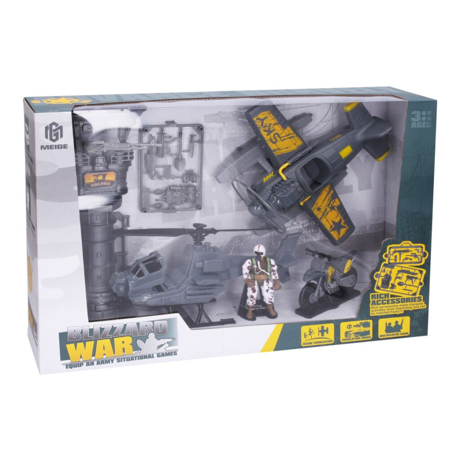 Obsahuje letadlo, věž, figurku pilota, motorku, vrtulník, zbraně a doplňky pro pilota.