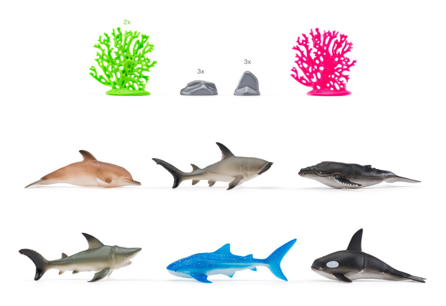 Celé balení má 24 figurek zvířat a například délka žraloka je 16 cm a rozměr balení: 57,5 x 33 x 9 cm.