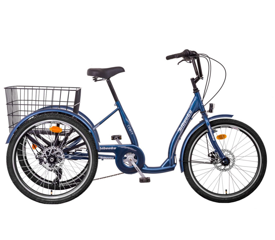 Trojkolka Liberty Comfy 6spd. Disk s rozšířenou zadní nápravou na 98 cm má tvarový základ na ocelovém rámu městského jízdního kola Comfy, které má nízkou úroveň spodní trubky (250 mm). Tříkolka je vybavena zadním 6 stupňovým měničem a diskovými brzdami na všech třech kolech.