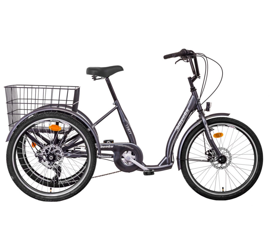 Trojkolka Liberty Comfy 6spd. Disk s rozšířenou zadní nápravou na 98 cm má tvarový základ na ocelovém rámu městského jízdního kola Comfy, které má nízkou úroveň spodní trubky (250 mm). Tříkolka je vybavena zadním 6 stupňovým měničem a diskovými brzdami na všech třech kolech.