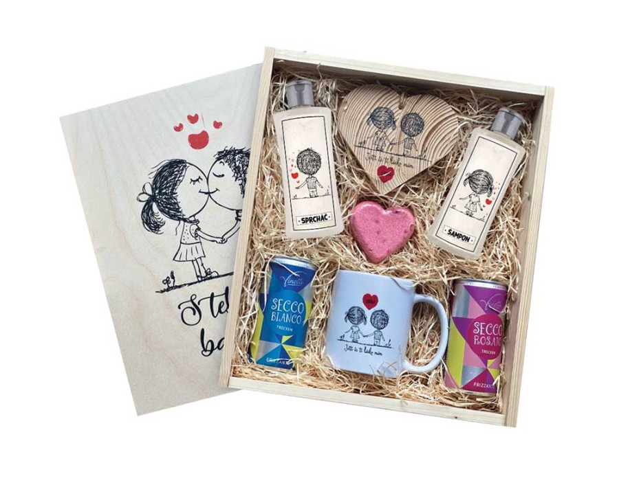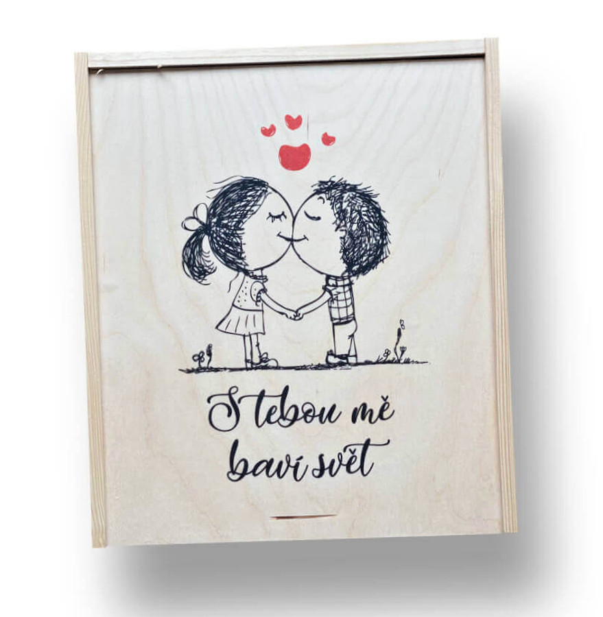 Originální dřevěná dárková bedna pro zamilované plná dárků pro dokonalý společný večer. Ručně vyrobená v Česku, s krásným zamilovaným potiskem a pečlivě vybraným obsahem.