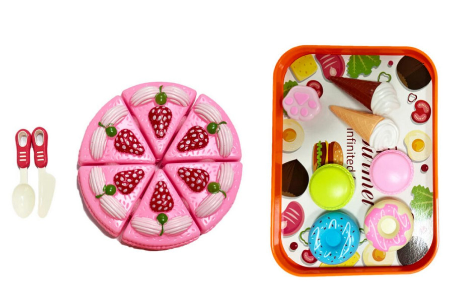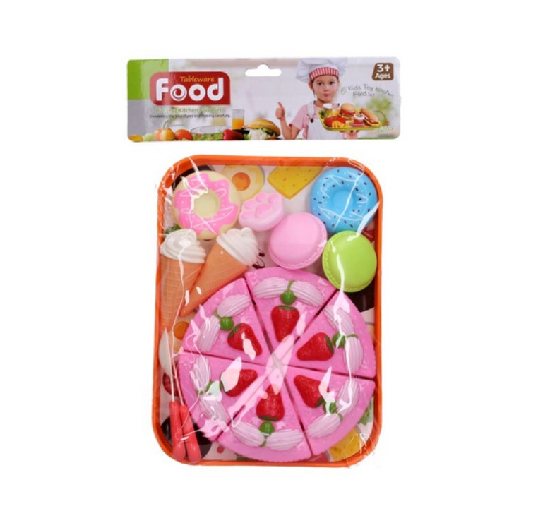 Dětský dort na krájení s příslušenstvím. Velikost 26cm. Obsahuje tácek, dort, příbor a jídlo. Hračka je vyrobena z plastu a neni vhodná pro děti do tří let věku. Jedná o hračku a neni určeno k jídlu.Materiál: plast.Věk:3+.