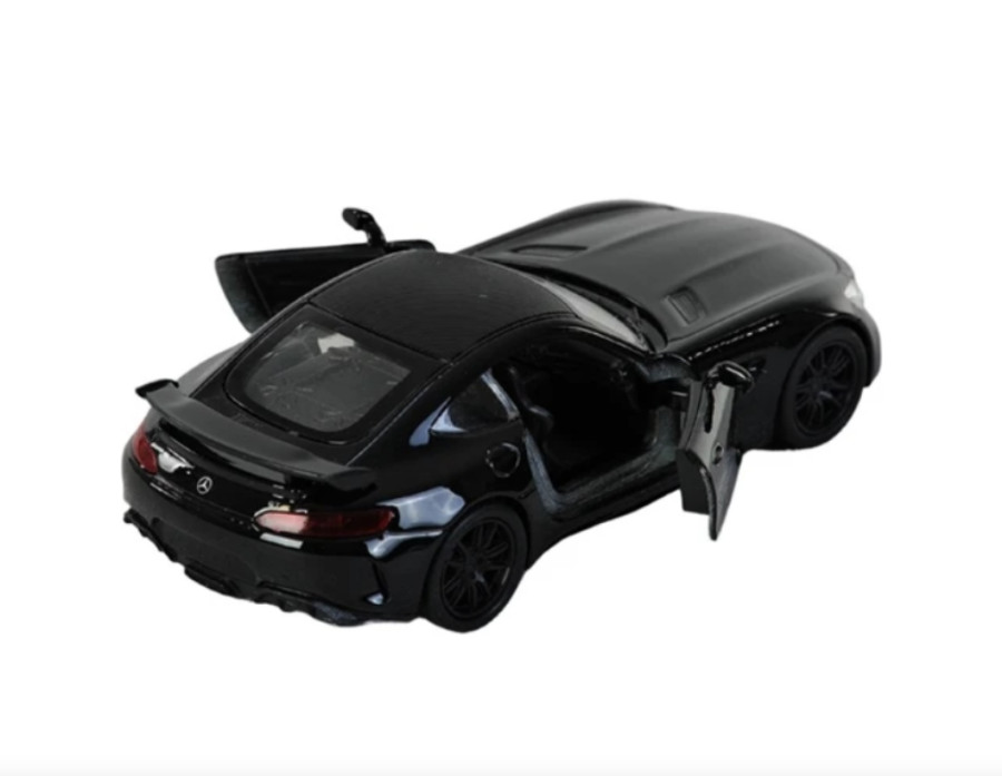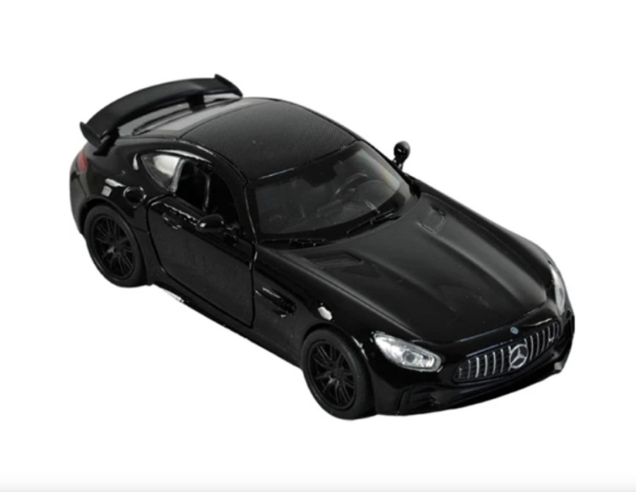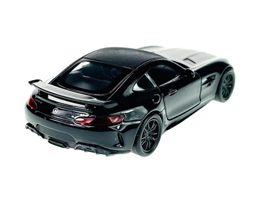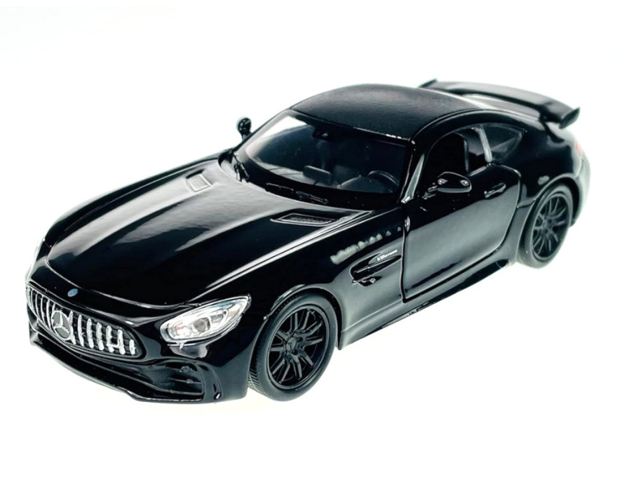 Kovový model auta Mercedes AMG GT R v černé barvě a měřítku 1:34/39 značky Welly. Model autíčka má kovové osy kol a detailní zpracování karoserie včetně interiéru automobilu. Na modelu se otvírají dveře.