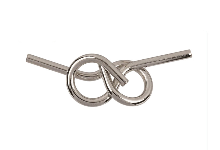Kovový hlavolam smyčka v retro krabičce má středně těžkou obtížnost a jeho balení obsahuje návod jak odělit od sebe jeho části bez použití násilí.
