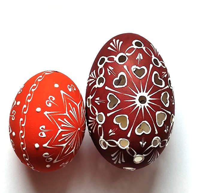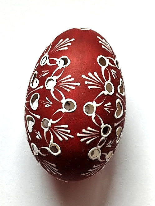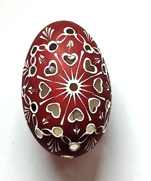 Husí kraslice děrovaná, natíraná akrylovou barvou a zdobená bílým voskem. Každé vajíčko je desinfikováno savem. Kraslice má na výšku cca 8,5cm.
