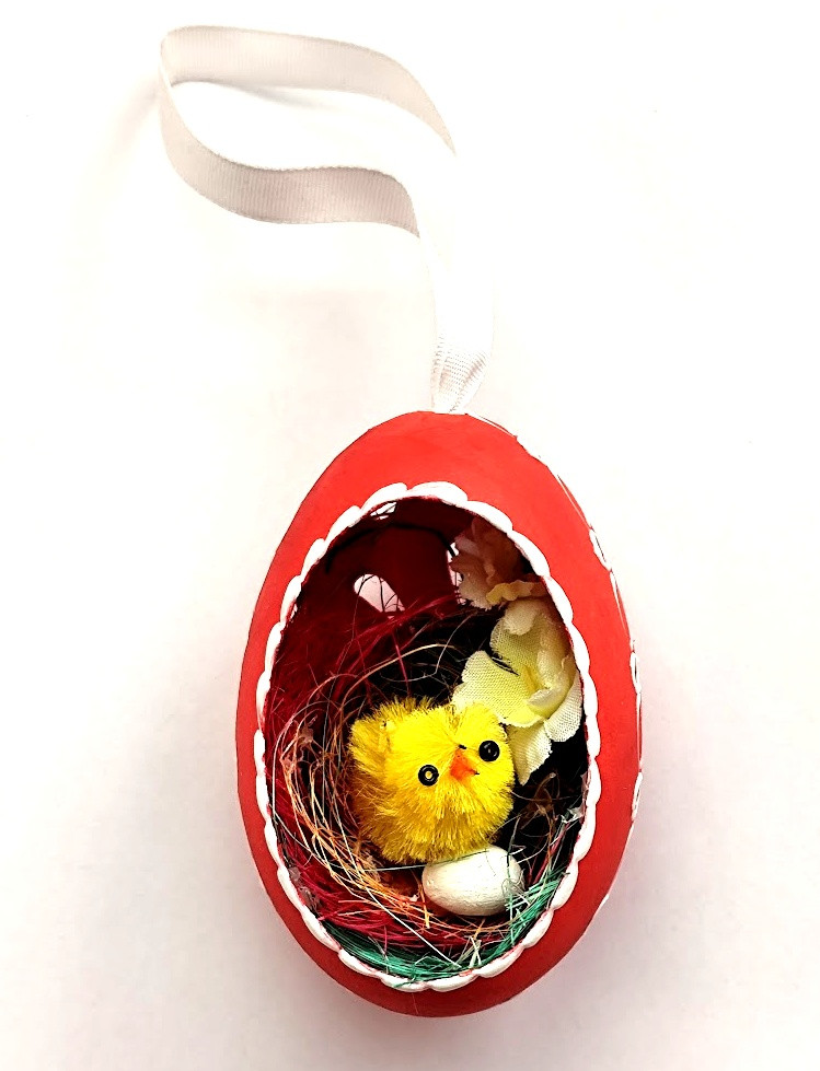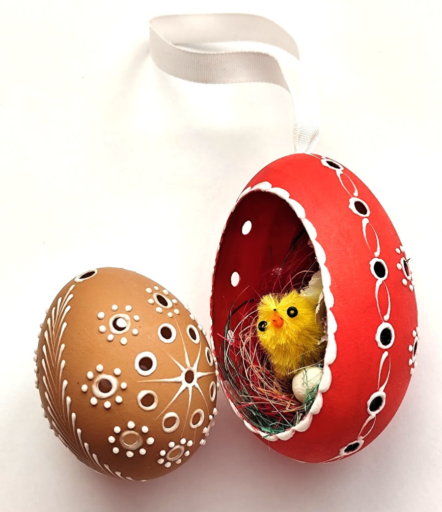 Husí kraslice děrovaná, natíraná akrylovou barvou a zdobená bílým voskem. Každé vajíčko je desinfikováno savem. Kraslice má na výšku cca 8,5cm. Kraslice je dozdobena hnizdečkem, slepičkou a vajíčkem. Kraslice je opatřena stuhou k zavěšení.