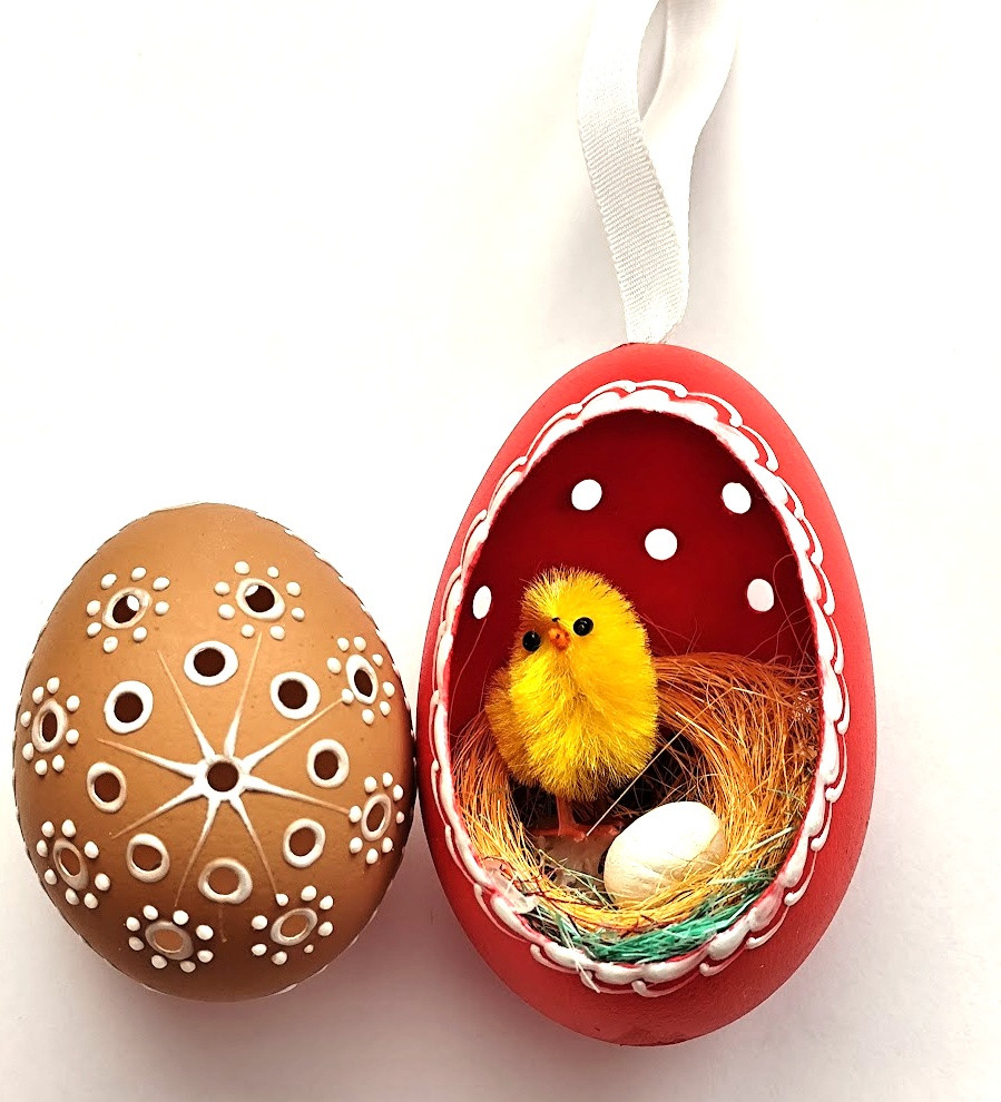 Husí kraslice děrovaná, natíraná akrylovou barvou a zdobená bílým voskem. Každé vajíčko je desinfikováno savem. Kraslice má na výšku cca 8,5cm. Kraslice je dozdobena hnizdečkem, slepičkou a vajíčkem. Kraslice je opatřena stuhou k zavěšení.