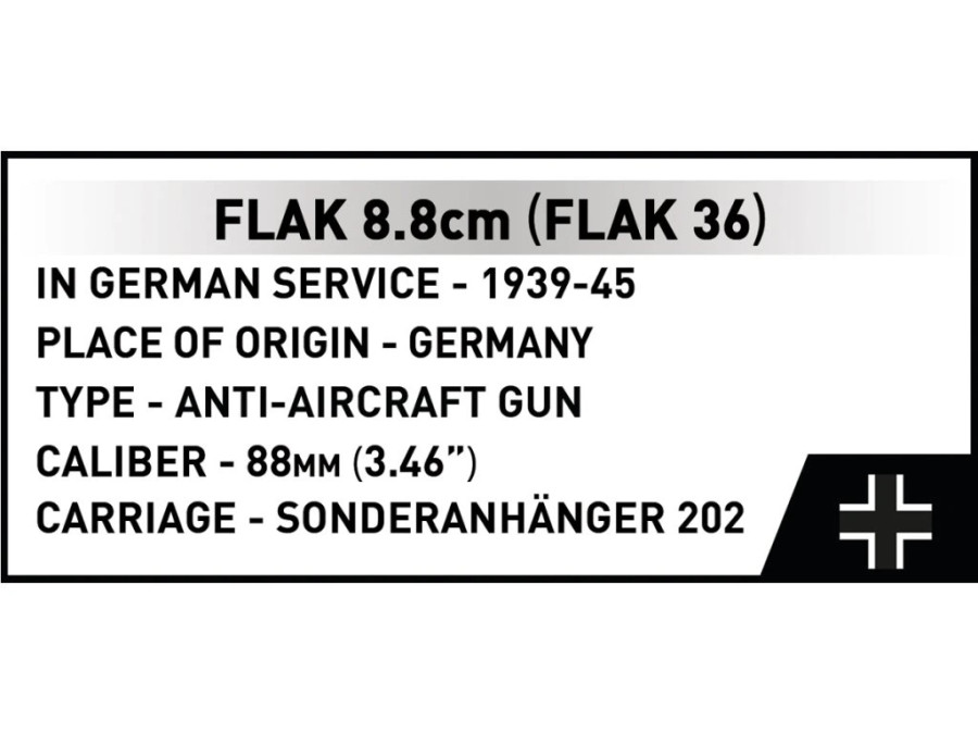Součástí balení jsou tři figurky příslušníků Luftwaffe v typických pouštních uniformách Afrika Korps, bedna na munici, náboje a sběratelská kostičková tabulka s názvem modelu a měřítkem. Rozměry sestaveného modelu jsou 43 cm na délku, 7,5 cm na šířku a 8,5 cm na výšku.