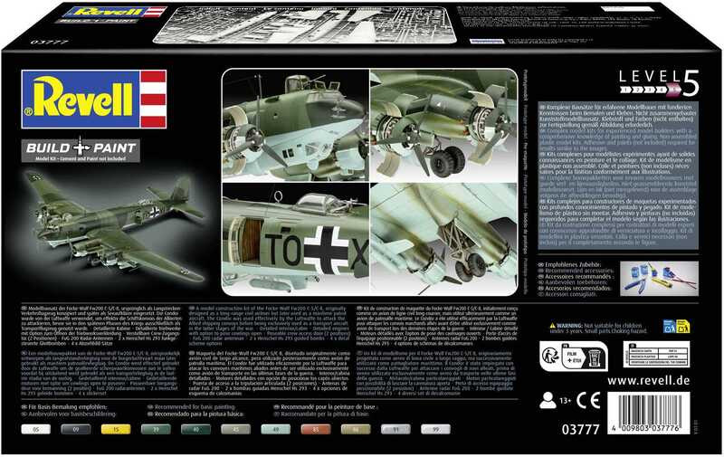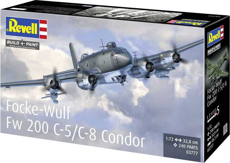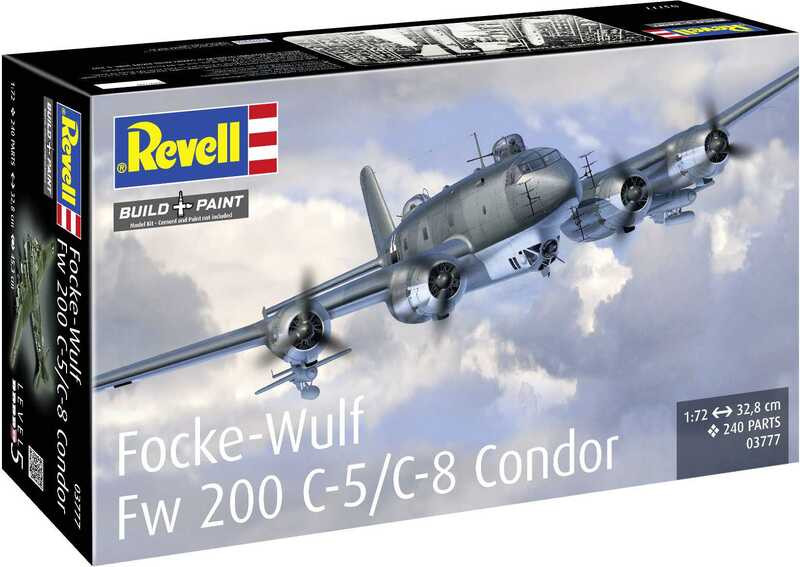Stavebnice Revell 03777 modelu letadla Focke-Wulf Fw 200 C-5/C-8 Condor ke slepení v měřítku 1:72. Balení obsahuje 240 dílků ke slepení.Informace o modelu:Tato vysoce kvalitní stavebnice nabízí ambiciózním modelářům perfektní příležitost, jak si věrně a detailně zrekonstruovat významný kus letecké historie. Fw 200 Condor, známý svým působivým doletem a všestrannými operačními schopnostmi, se nyní objevuje v propracované verzi.Focke-Wulf Fw 200 Condor byl původně vyvinut jako civilní dálkový dopravní letoun a v roce 1938 vytvořil rekord na trase Berlín-New York. Během druhé světové války byl přestavěn na námořní průzkumný letoun a bombardér. Verze C-5/C-8 měla zesílenou výzbroj a modernizovanou elektroniku, což z něj učinilo účinný průzkumný letoun na dlouhé vzdálenosti.Speciální funkce: